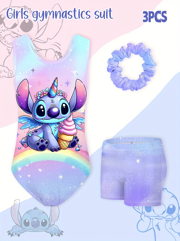 Girls' Gymnastics Suit Set, 3pcs, Disney Stitch Gymnastics Outfit with Matching Shorts and Hair Ties, 3D Printed Design for Dance, Gymnastics, Practice, Riding, Girls' Gymnastics Outfit, for Outdoor