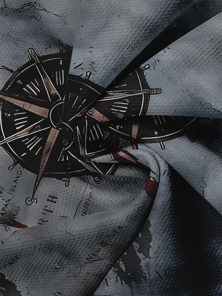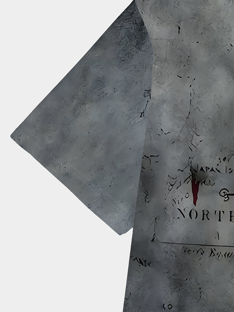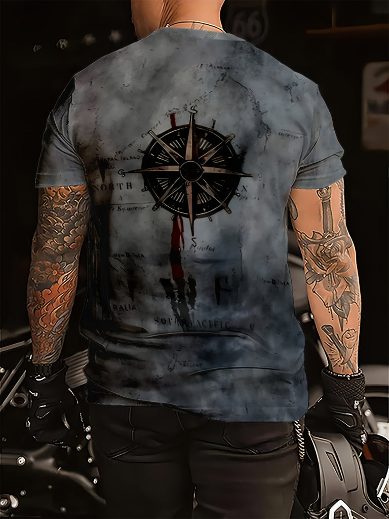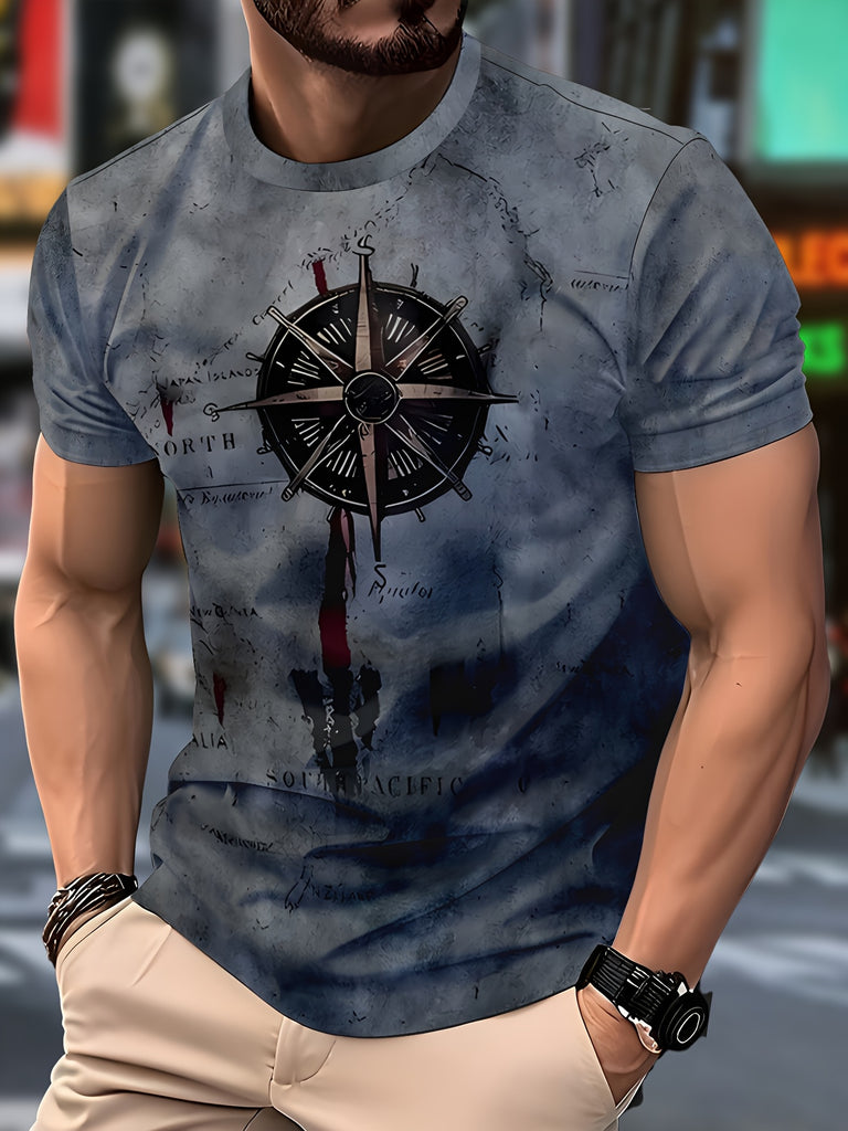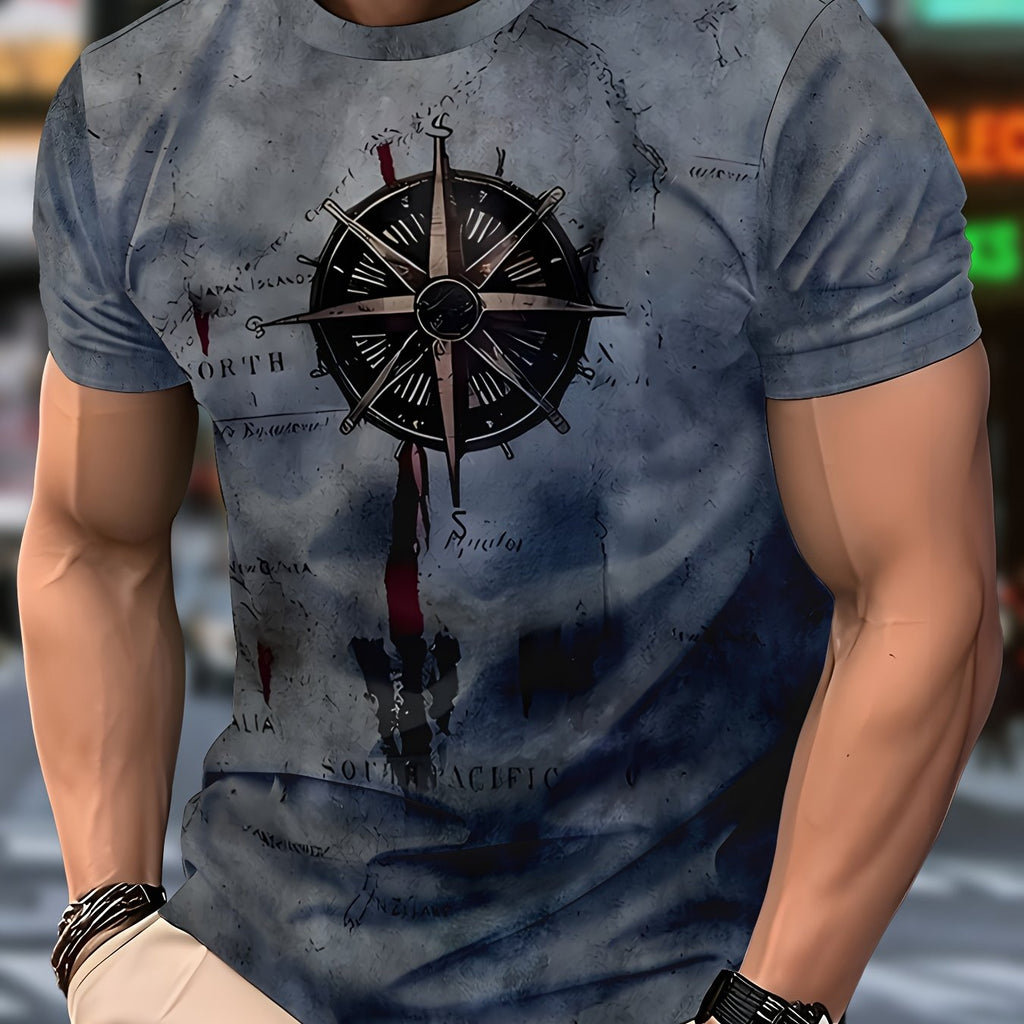 Men's Stylish Compass Design Polyester T-Shirt - Casual Round Neck Tee with Vintage Map Print, Machine Washable, Regular Fit, 100% Polyester, Lightweight & Breathable for Casual Attire