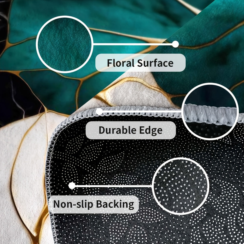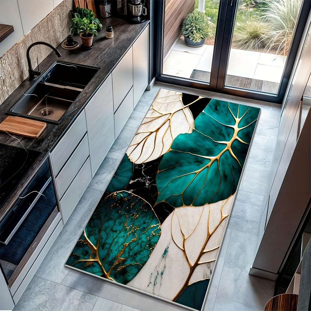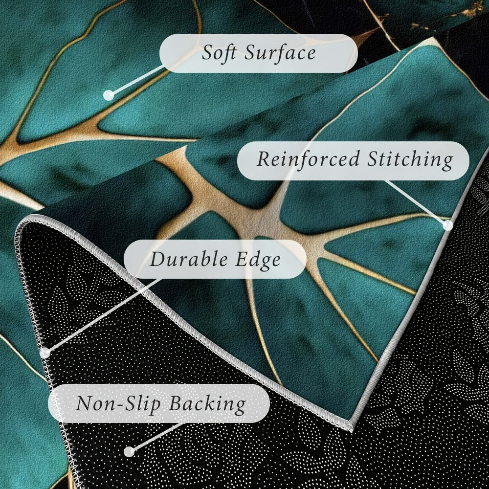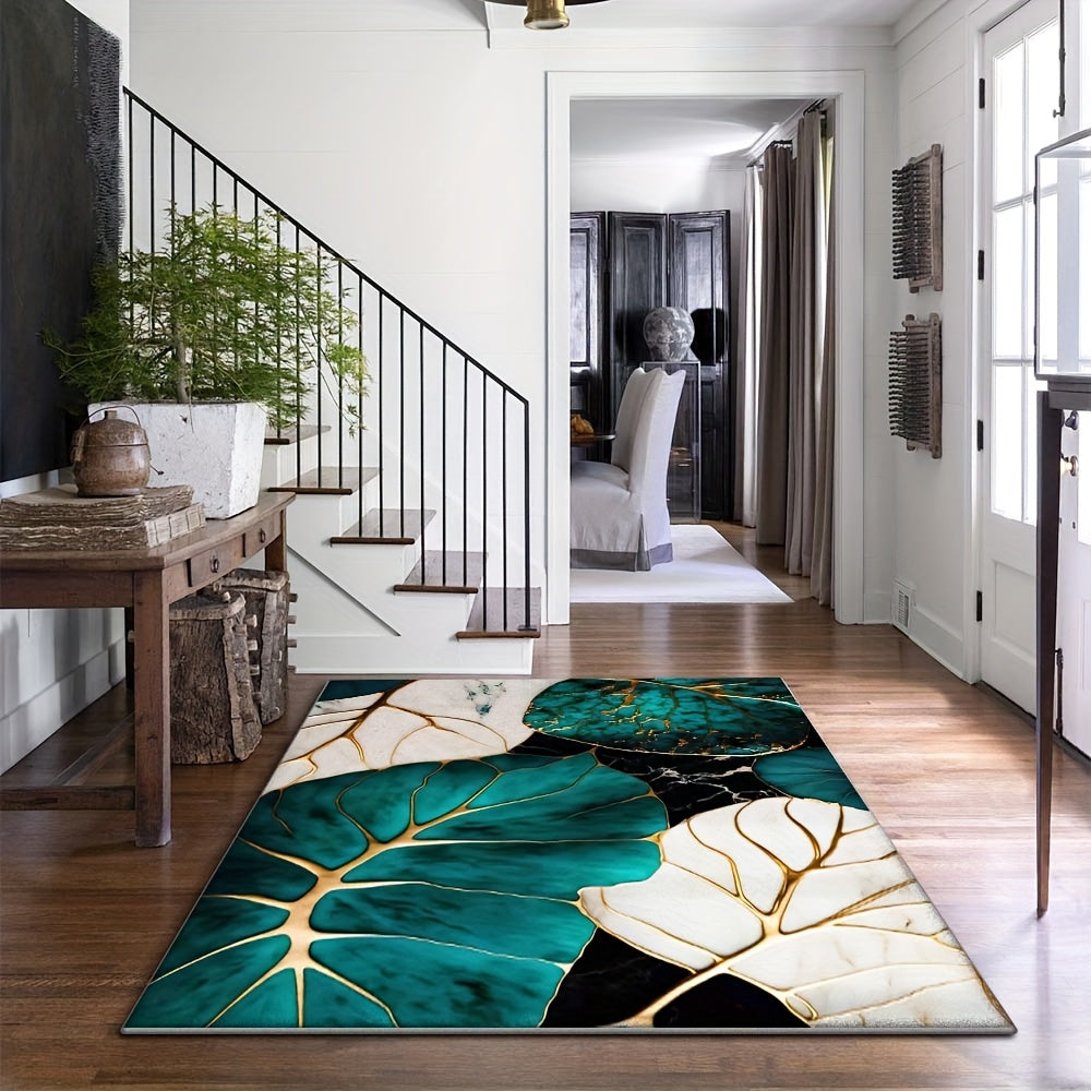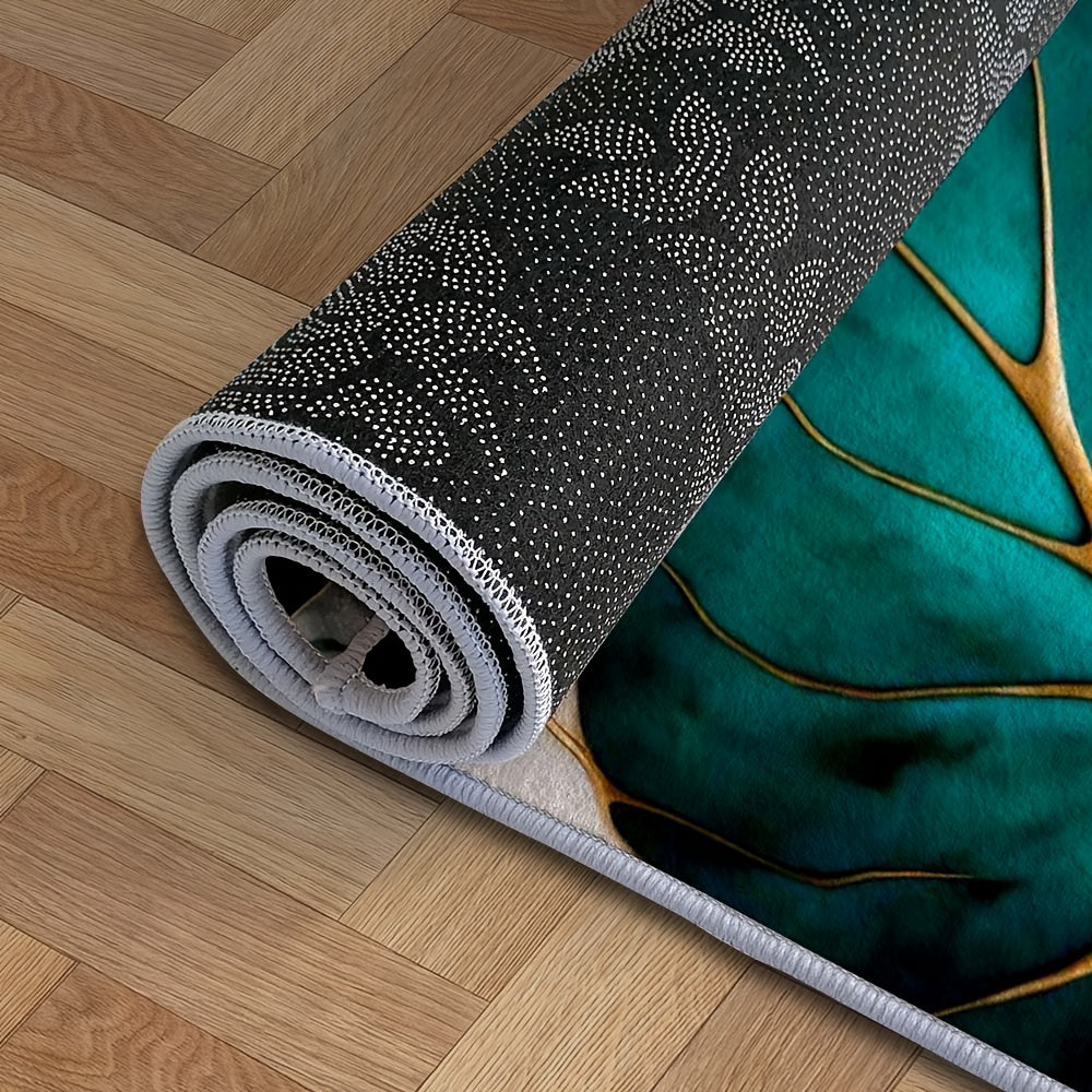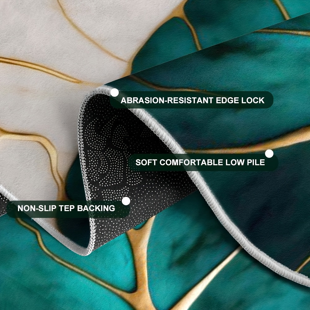 Modern Minimalist Washable Area Mat – Soft, Durable, Non-Slip Polyester Mat with Elegant Leaf Print Design in Teal Blue & Golden for Living Room, Bedroom, Dining, and Home Office, Dining Room Decor | Sophisticated Room Accent, Rugs for Living Room