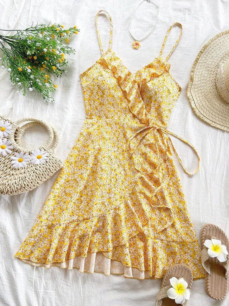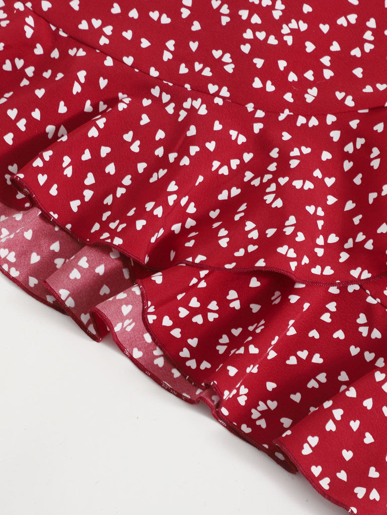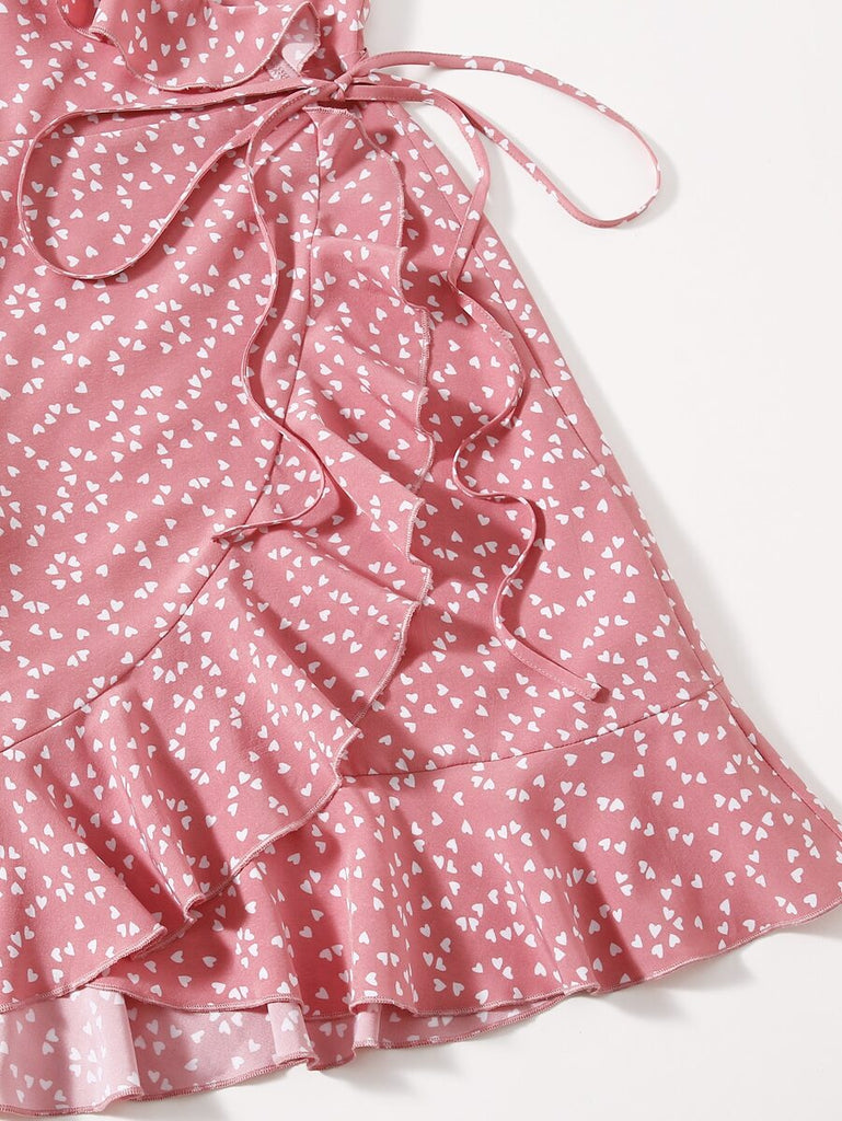 Women's Allover Heart Print Ruffle Detail Wrap Cami Dress